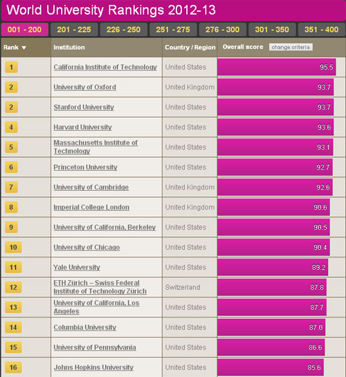 “The time” сэтгүүл жил болгон дэлхийн хамгийн шилдэг 200 их сургуулийг шалгаруулдаг билээ. Энэ жагсаалтыг Калифорнийн технологийн их сургууль тэргүүлж, Оксфордын их сургууль, Стэнфордын их сургууль, Харвардын их сургуулиуд түүний араас жагссан байна. Энэхүү жагсаалтанд дэлхийн 200 гаруй их сургууль орсноос 76 нь АНУ-ых байна. Харин Токиогийн их сургууль 27 дугаар байрт орж Азийн их дээд сургуулиудын дунд тэргүүлж байна. Мөн Бээжингийн их сургууль өмнөх жилийн амжилтаа дээшлүүлж 46-р байрт орсон байна. Энэхүү шалгаруулалтыг боловсролын болон судалгааны хөтөлбөрүүдийн төвшин, шинжлэх ухааны бүтээлүүдээс нь иш татсан байдал, гадаадаас ирж суралцаж байгаа оюутнууд болон ажиллаж байгаа мэргэжилтнүүд зэрэг үзүүлэлтүүдийг харгалзан үздэг байна.