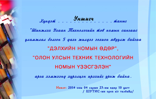 ДЭЛХИЙН НОМЫН ӨДӨР, ОЛОН УЛСЫН ТЕХНИК ТЕХНОЛОГИЙН НОМЫН ҮЗЭСГЭЛЭН арга хэмжээнд хүрэлцэн ирэхийг урьж байна.