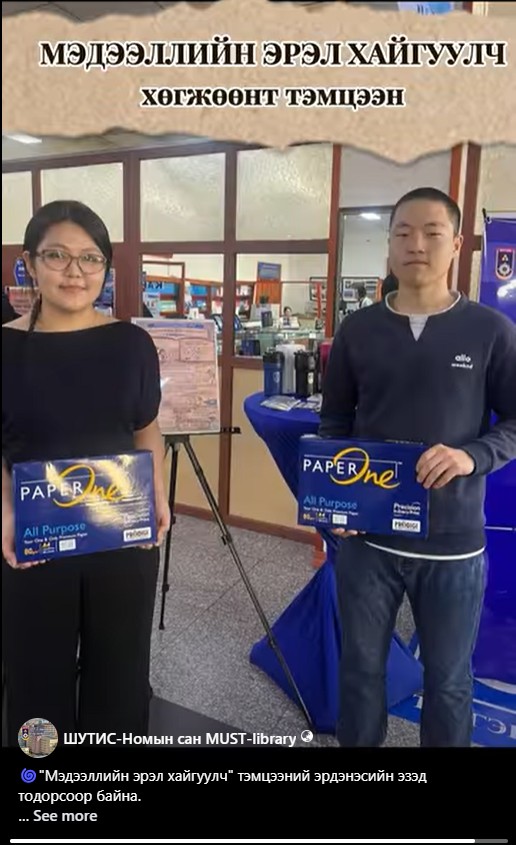 “МЭДЭЭЛЛИЙН ЭРЭЛ ХАЙГУУЛЧ” танин мэдэхүйн тэмцээнийг дээрх хугацаанд өдөрт 2-3 удаагийн давтамжтай зохион байгууллаа. Тэмцээнд 2 хүний бүрэлдэхүүнтэй багаараа оролцож өртөөчилсөн байдлаар сонирхолтой даалгавруудыг гүйцэтгэж, олон олон бэлгийн эзэд тодорлоо.